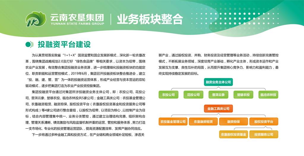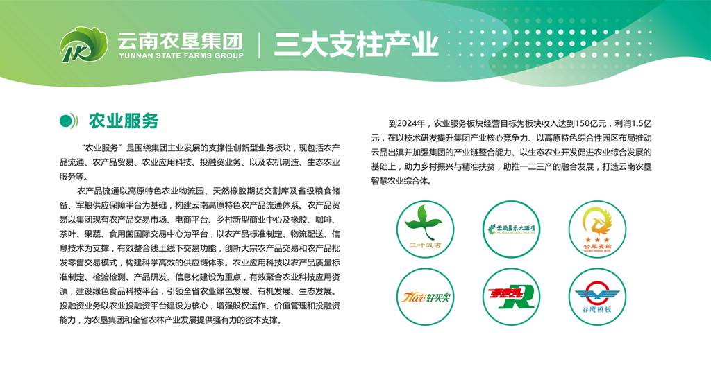 包括农产品流通、农产品贸易、农业信息及应用科技、投融资业务、农机制造、生态农业服务等业务。